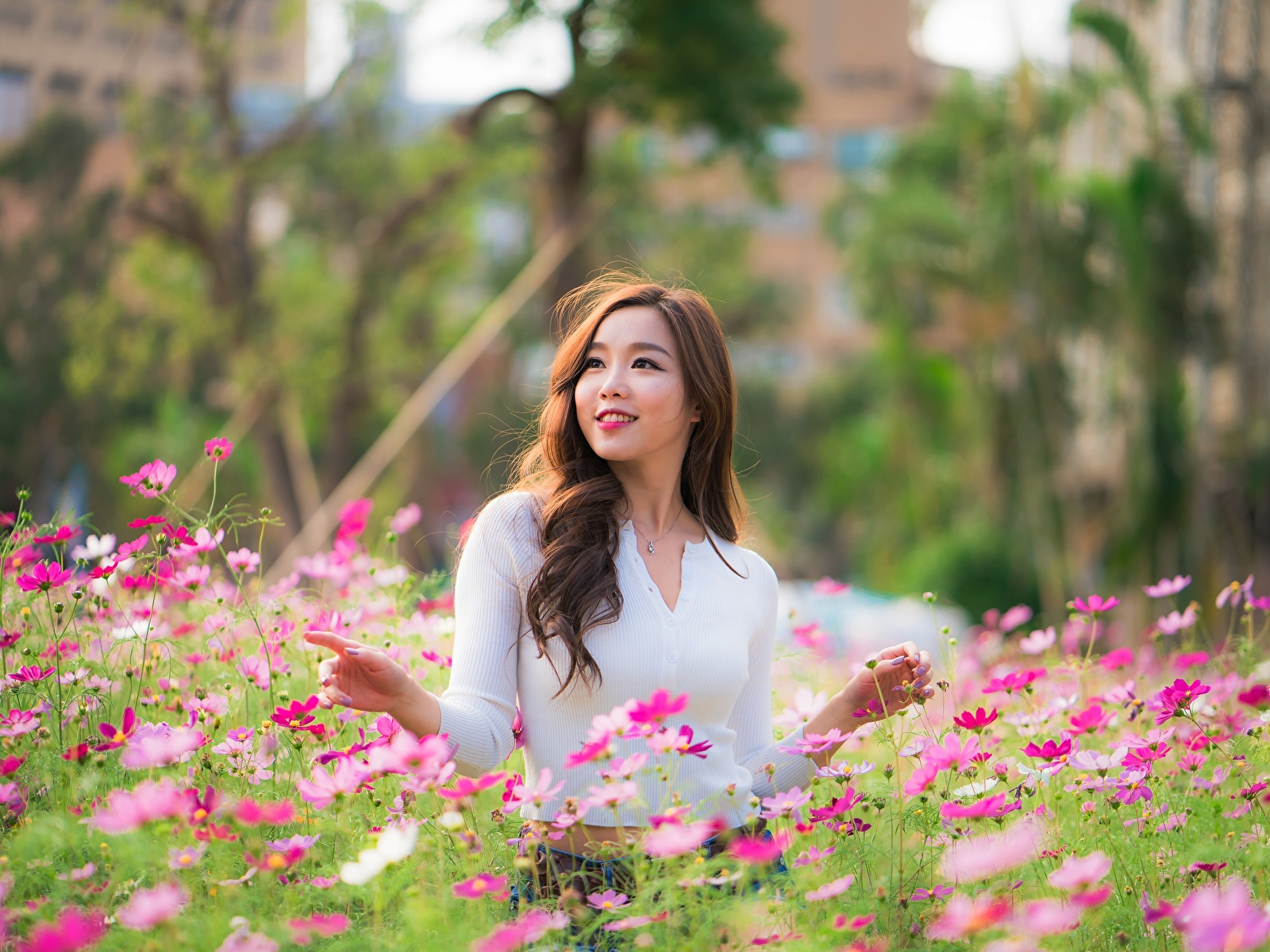 Asiático Cosmos planta Bokeh Pose Sonrisa Cabello castaño Hermoso Chicas imagenes 1600x1200