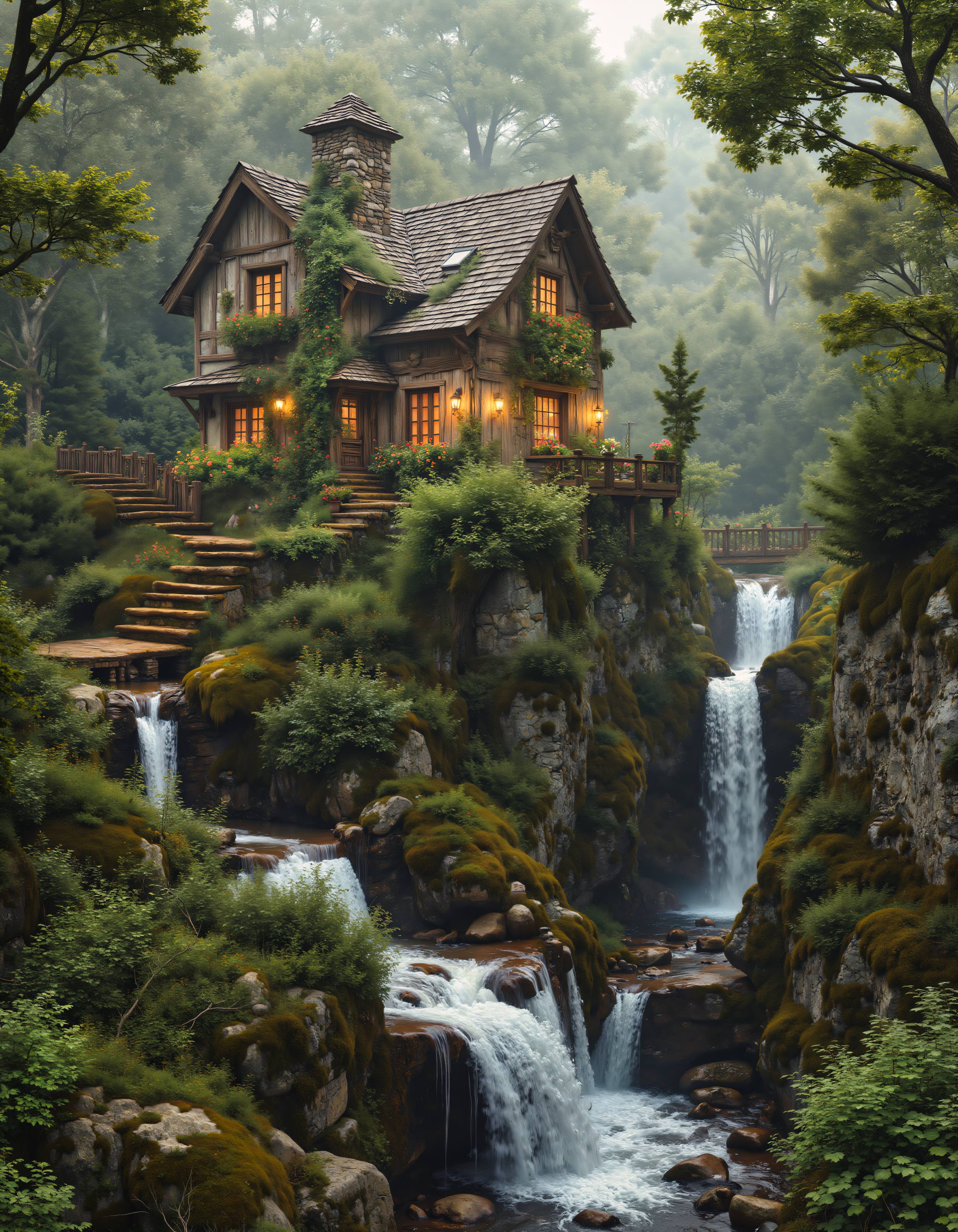 forêt, rivière, Bâtiment, cascade fond d'écran image télécharger sur votre Tablette, Téléphone mobile