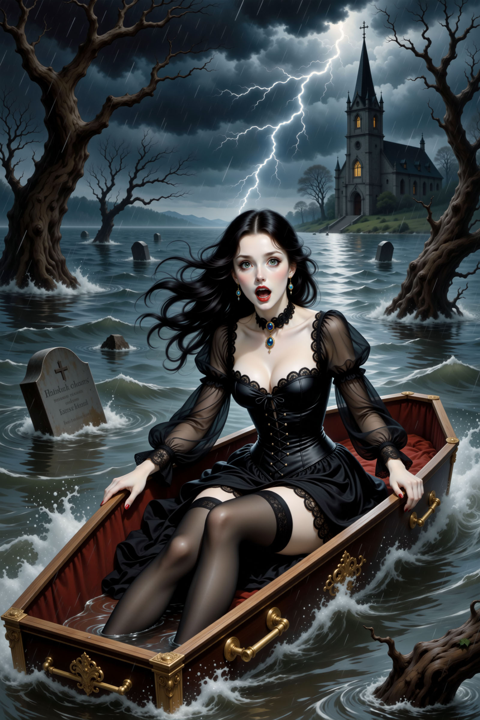 Bateau Château fort Cheveux noirs Fille Peur Foudre Nuit Jambe Bas Les robes Ai Filles photo