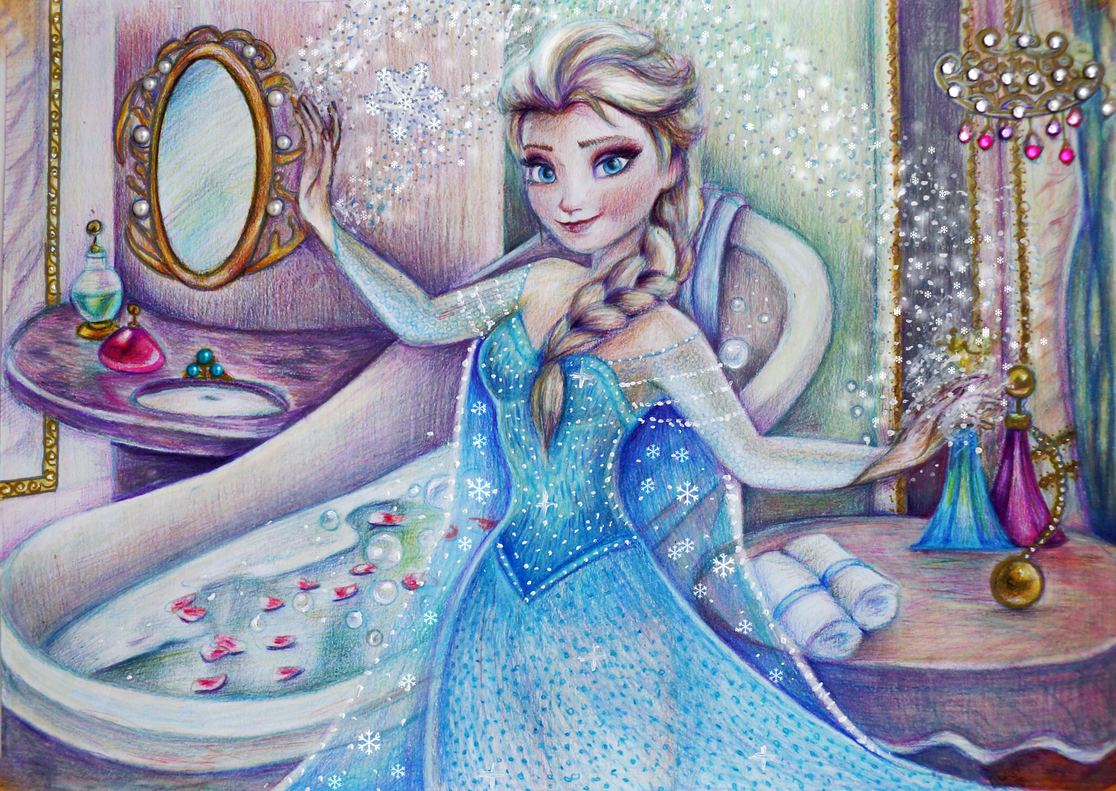 アナと雪の女王、ディズニー、描かれた壁紙、Elsa、三つ編み、凝視、ドレス、漫画、少女、写真