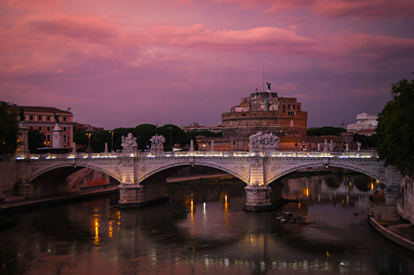 ローマ、イタリア、川、橋、要塞、夜、都市、写真、600x399