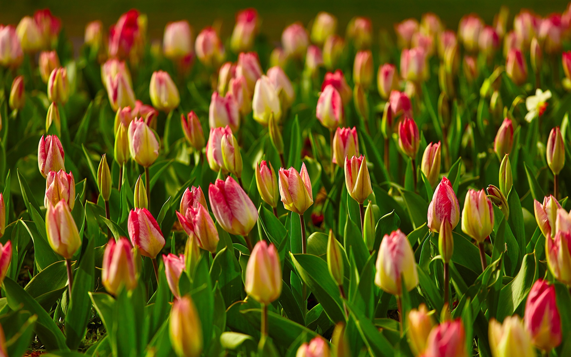 畑、たくさん、チューリップ、ボケ写真、花、写真、1920x1200