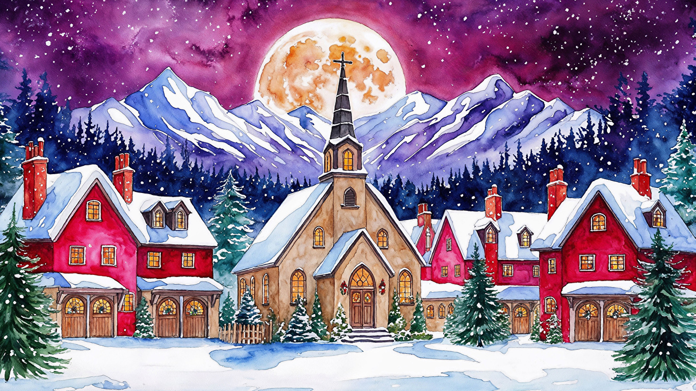 新年、山、冬、住宅、教会堂、描かれた壁紙、月、雪、トウヒ属、自然、写真、1366x768