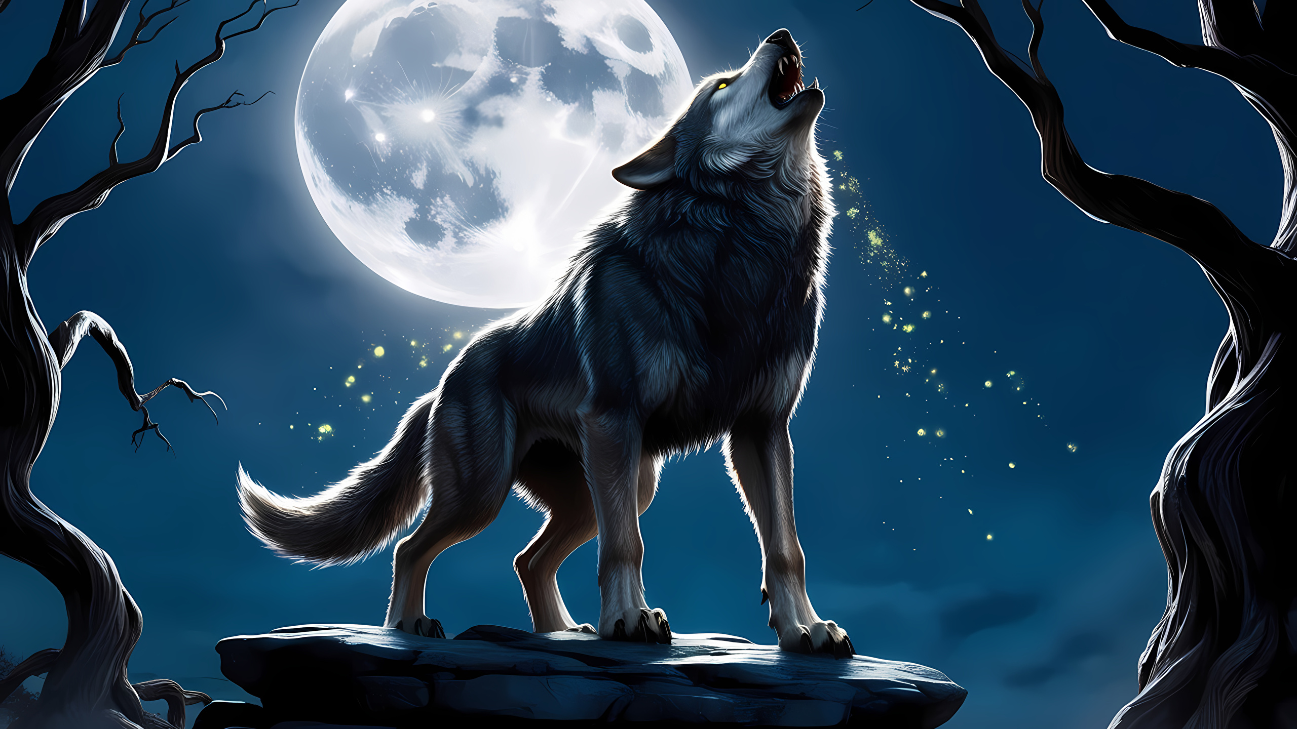 オオカミ、夜、月、Ai、動物、写真、2560x1440