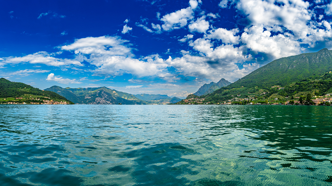 イタリア、山、湖、Lago d'Iseo、雲、都市、写真、1366x768
