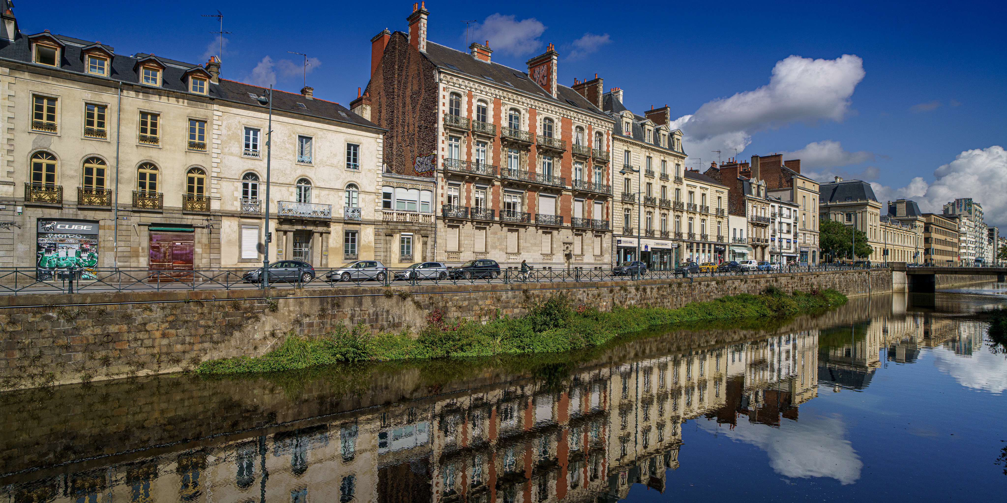 フランス、川、住宅、Rennes、ウォーターフロント、倒影、都市、写真