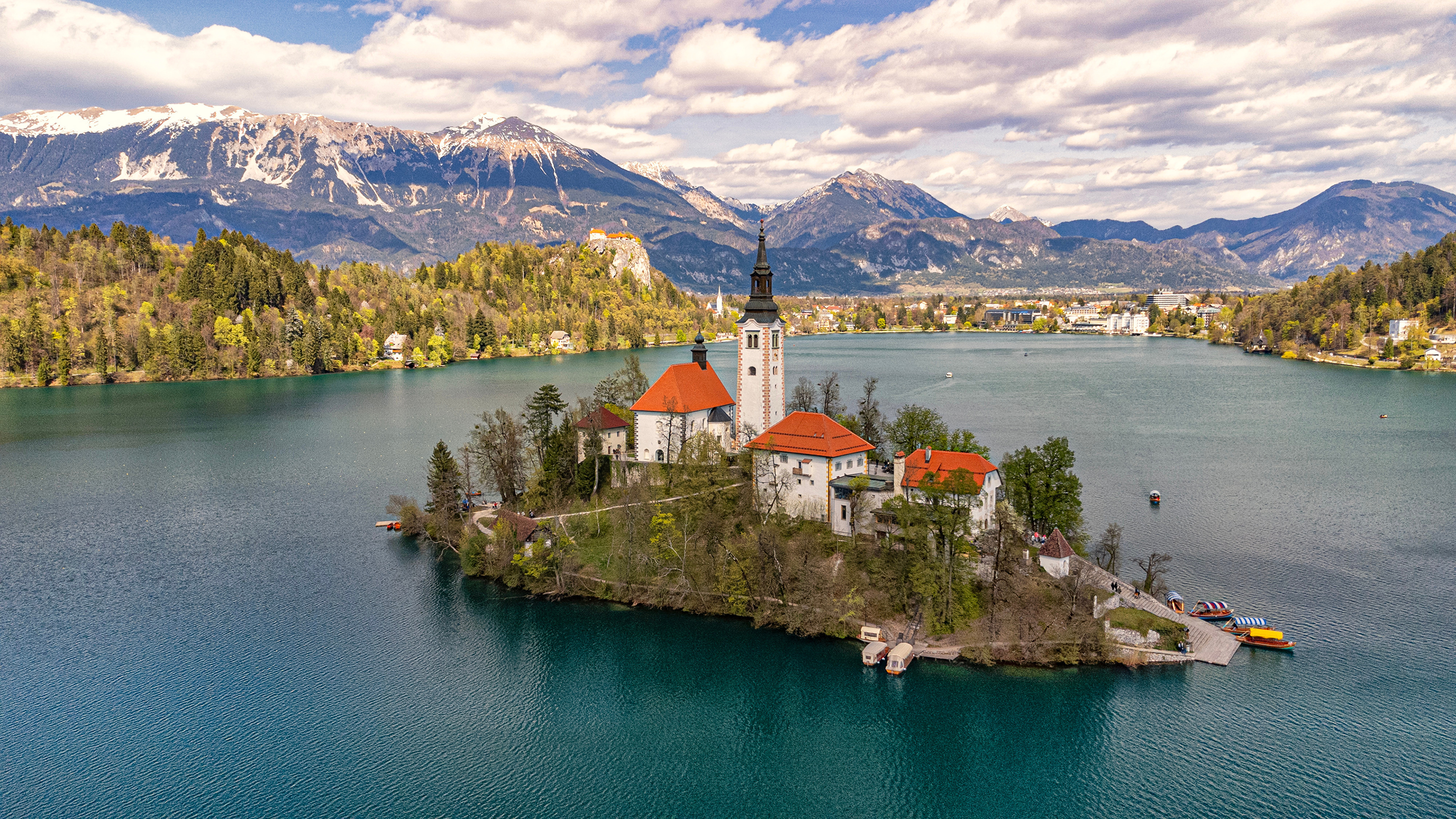 スロベニア、湖、島、住宅、教会堂、山、Bled、雲、自然、写真、3840x2160