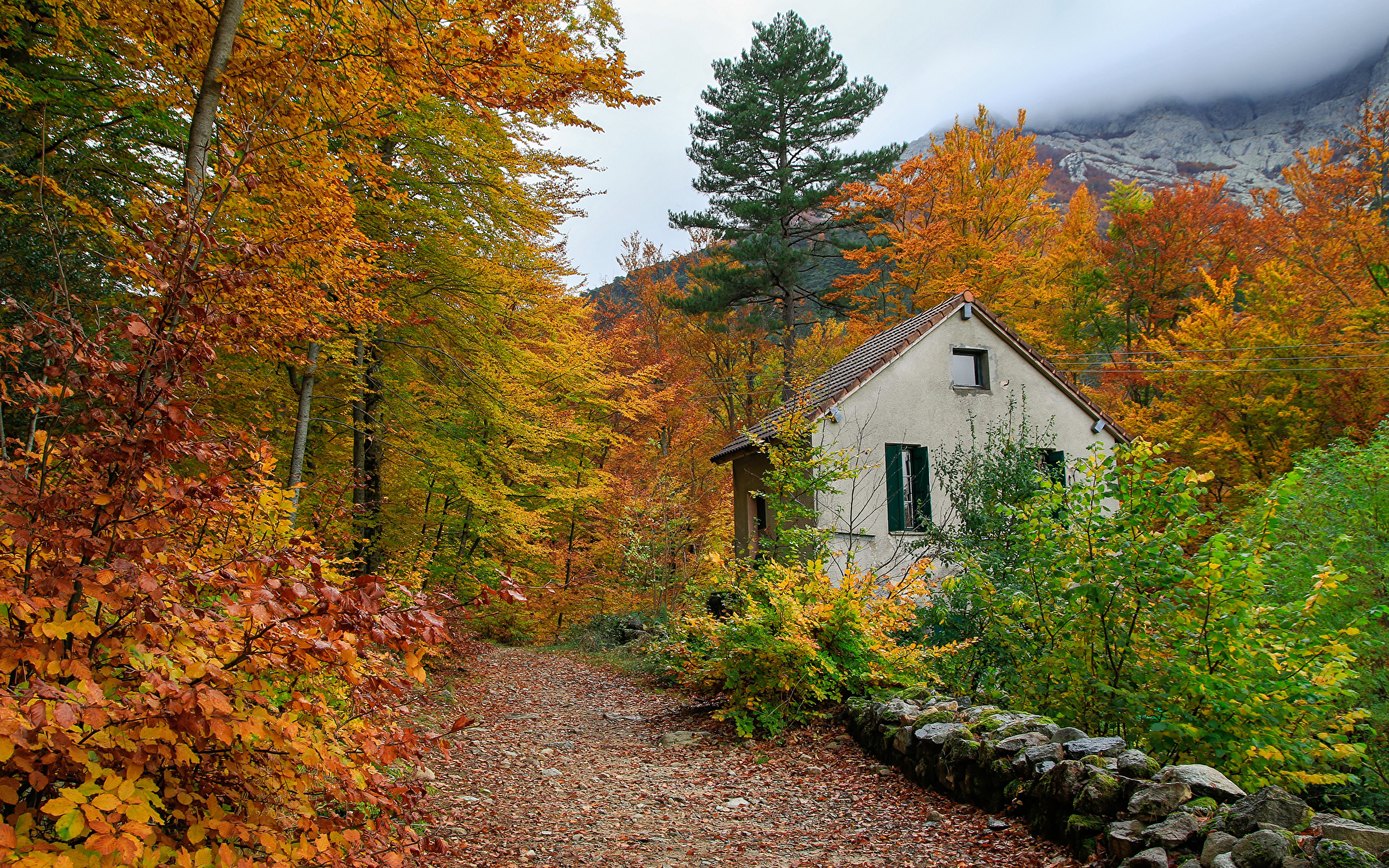 Francja Domy Drogi Jesień Kamienie Corsica Liście Drzewa Natura zdjęcia 1920x1200 przyroda, jesienne, budynki, budynek, kamień, droga tapety zdjęcia pobierz na pulpit PC, Tablet