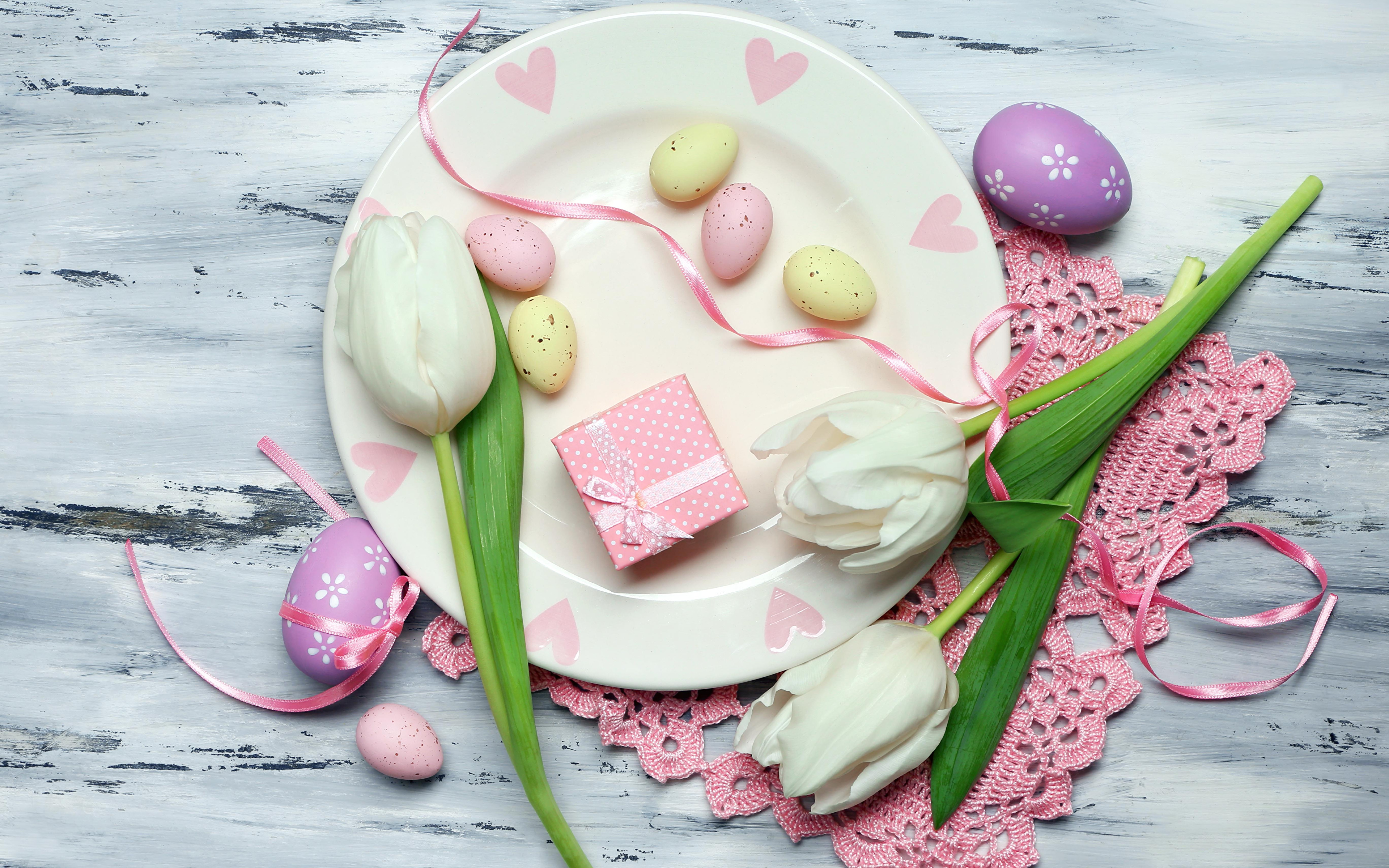Wielkanoc Tulipany Talerz Pudełko Prezenty Jajka Kwiaty zdjęcia 3840x2400