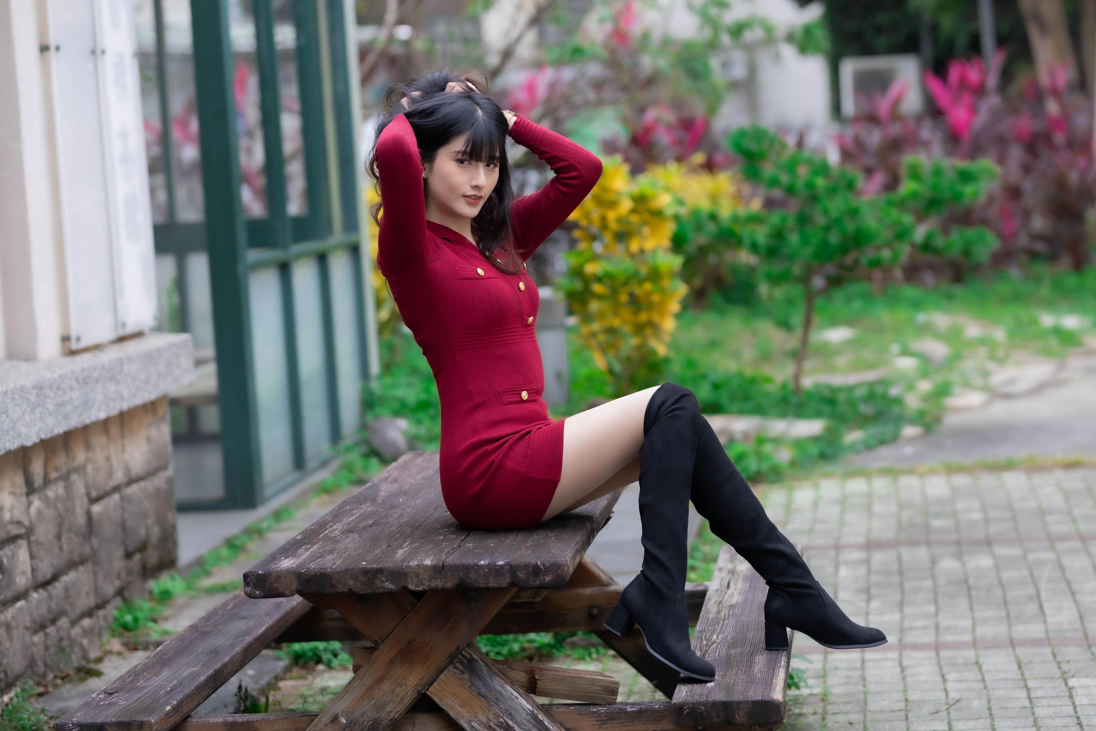 Azjaci Stół Siedzi Nogi Kozaczki Sukienka Brunetka Dziewczyny zdjęcia 4500x3000