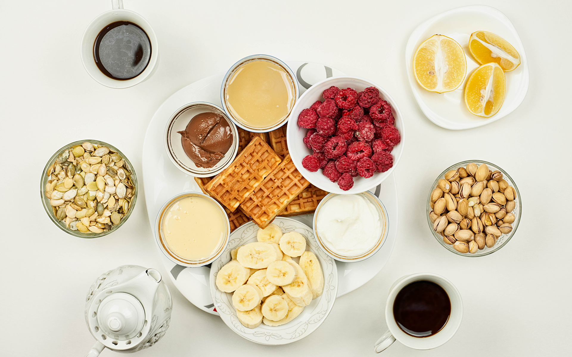 Kaffe Hallon Nötter Våfflor Choklad Bananer Apelsin frukt Grå bakgrund Tekopp Grädde Mat foton 1920x1200